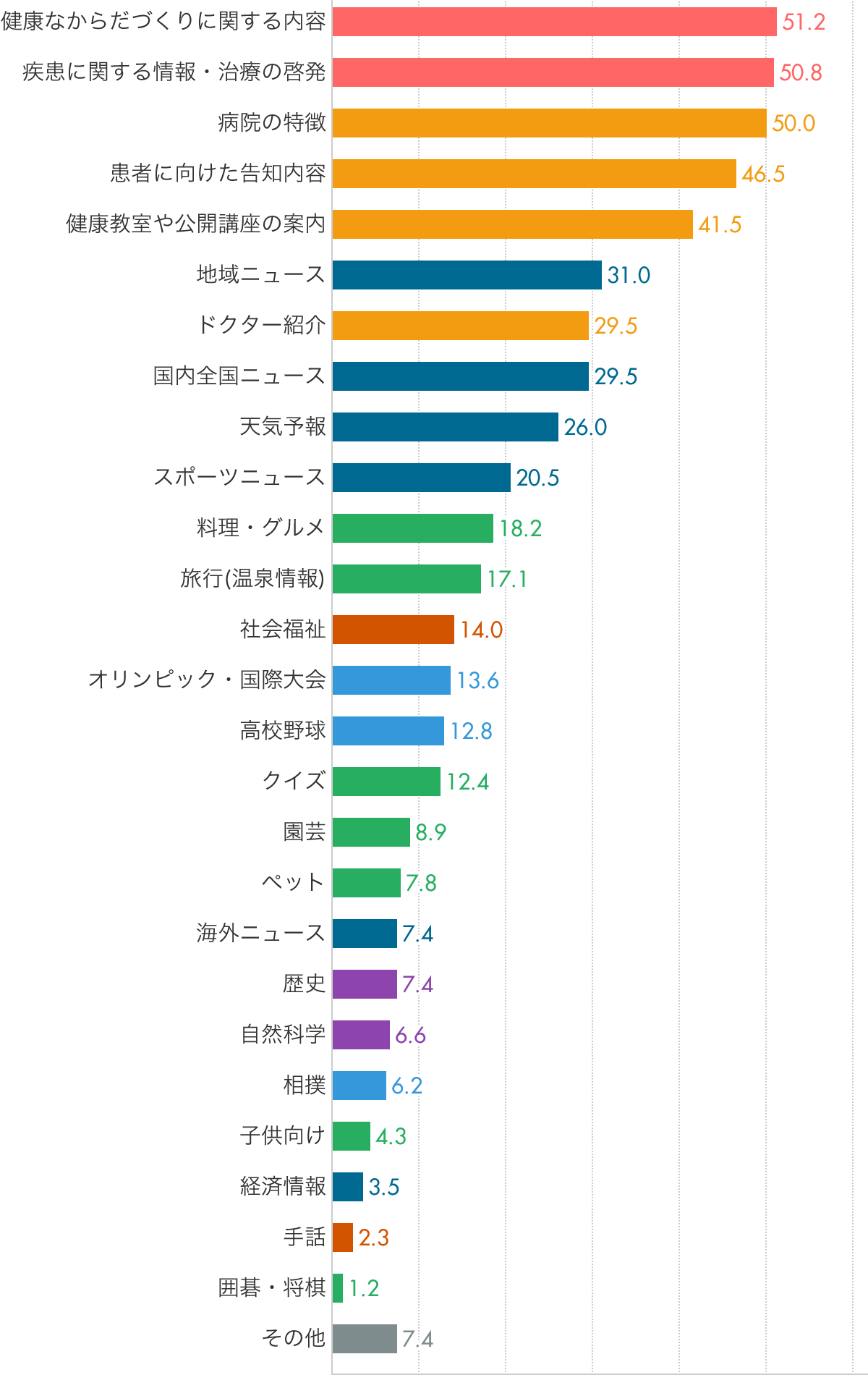 一方、趣味や娯楽情報といった内容については、「料理・グルメ」18.2%、「旅行(温泉情報)」17.1%など全体的に低い数値となりました。これは、医療機関側に情報ソースがないこと、テレビや雑誌、インターネットを通じて個人で情報収集できる内容であることが考えられますが、医療機関を受診したこの機会に改めて健康の大切さを考えてほしい…という思いがあるのでしょう。