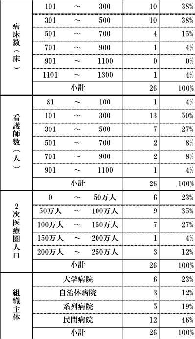 質問票に回答していただいた26施設の医療機関の特徴を、病床数・看護師数・2次医療圏人口、組織主体にて見ていきます。(表1)
