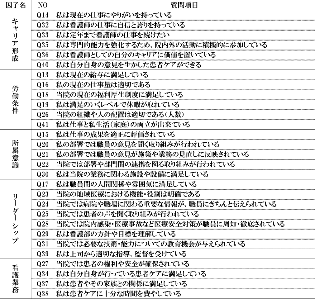 なお、因子名については本研究において見直しを行い、キャリア形成・労働条件・所属意識・リーダーシップ・看護業務としています。(表4)