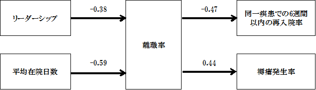 もしくは、離職率が低下(上昇)すると同一疾患での6週間以内の再入院率が上昇(低下)する。 - 褥瘡発生率が上昇(低下)すると離職率が上昇(低下)する。