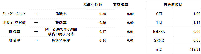 パス解析の結果、リーダーシップが発揮されているかどうかと、平均在院日数の長短が、離職率を上下させ、離職率の上下が同一疾患での6週間以内の再入院率と褥瘡発生率の上下に影響を与えていることが明らかになりました。モデルの適合度を示すGFIやRMSEA等の指標から適合度は十分でした。